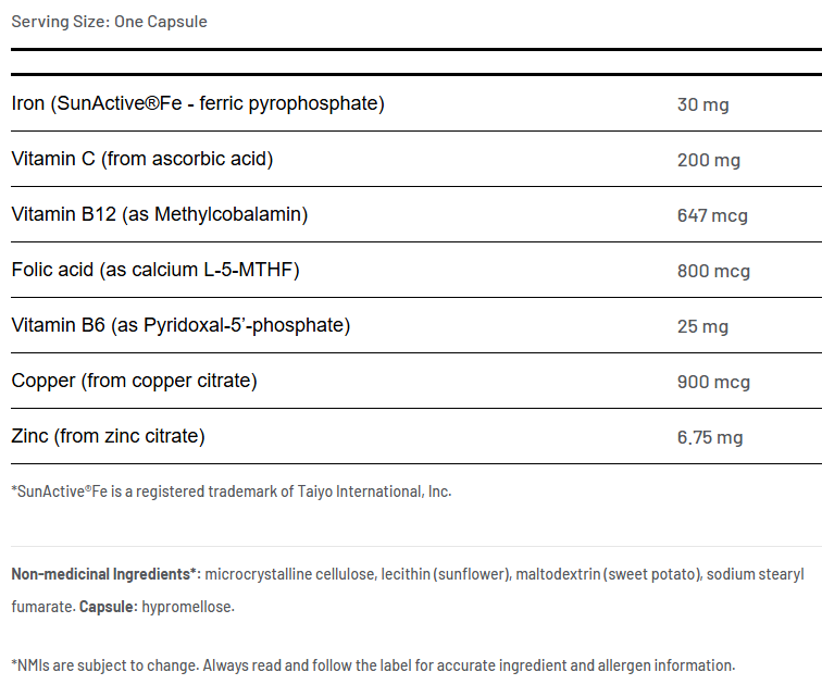 - Includes minerals and vitamins that support the proper absorption of iron