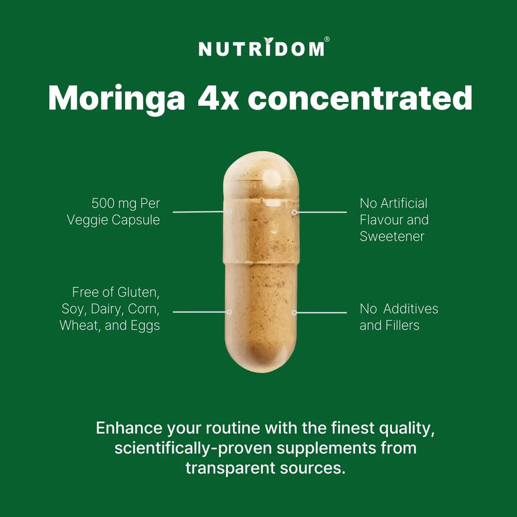 Nutridom Moringa Leaf Capsules are made from high quality Moringa oleifera extract, delivering 4000mg per daily serving.
