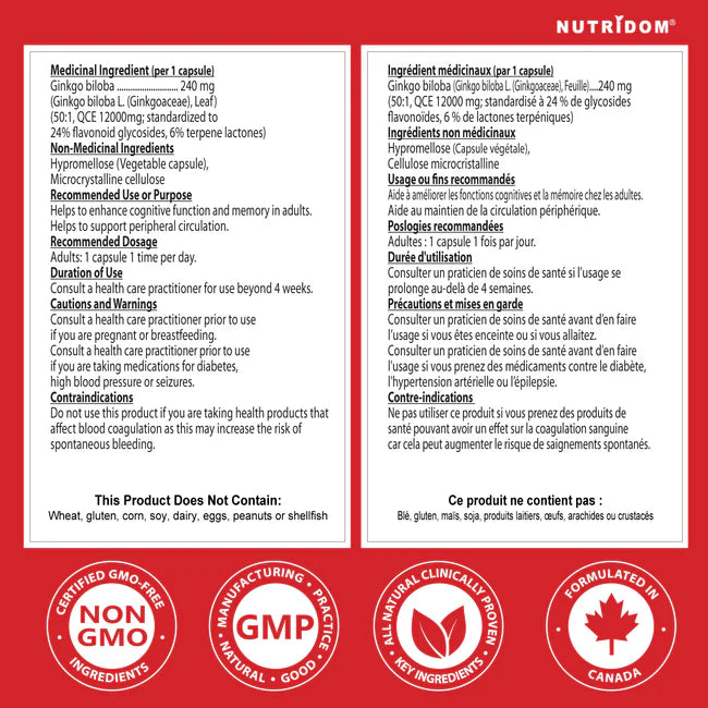Nutridom Ginkgo Biloba delivers the equivalent of 12,000 mg of raw herb (QCE) per capsule, standardized to 24% flavonoid glycosides and 6% terpene lactones. These active compounds are key to ensuring potency and consistent effectiveness.